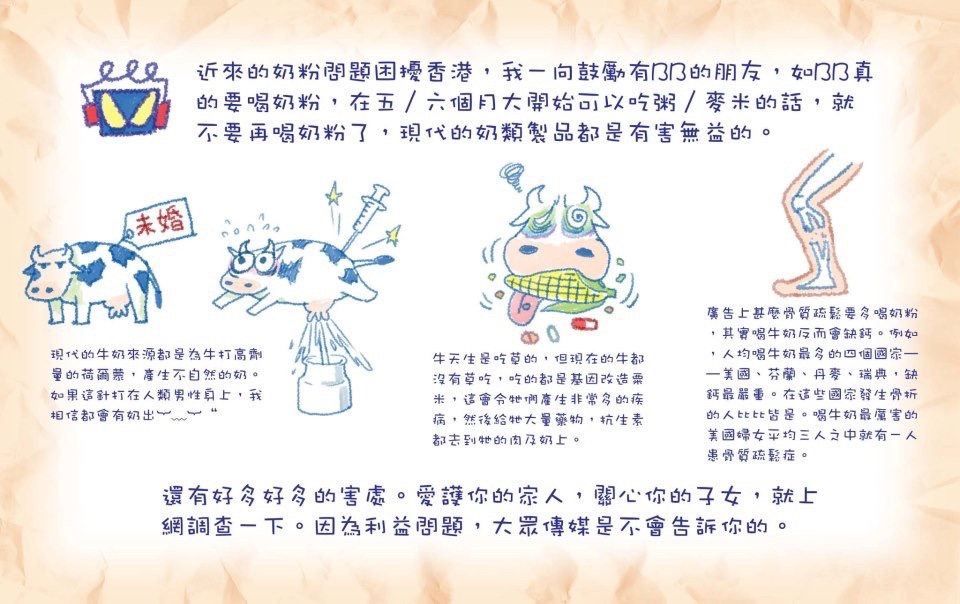 真正吃草的牛,沒有打激素及抗生素的話,其牛奶是富含Omega 3的,但激素牛的牛奶則充滿化學物質,以基因改造粟米為糧食、種植時所採用的農藥及化肥、所打入身體的激素及抗生素全部都混合在牛奶之中,由於乳頭長期被擠壓,因而腫大及發炎,當中發炎物質同時混亦入牛奶之中⋯⋯這樣的牛奶🥛你還敢喝嗎?