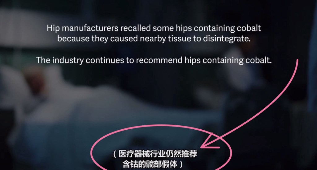 這位醫生有追根究柢的動力,不只一邊研究自身病例,也開始挖掘使用相同鈷鉻合金人工髖關節病患的病歷,終於漸漸得到結論——原來,鈷鉻髖關節會造成金屬中毒,全部病人都出現同樣情況,間接使人疼痛與失智、神經錯亂、柏金遜、記憶力衰退、視力喪失、重者還會有心臟問題⋯⋯