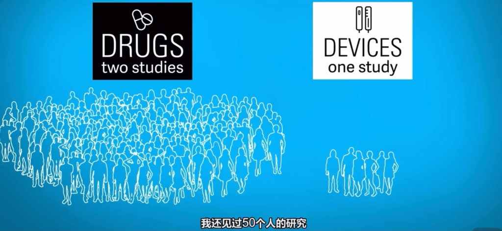 事實上不如大家所想像,心臟起搏器、人造關節置換等等醫療設備並非經過嚴密的測試及監管,才通過審批置換入體內,事實可能恰恰相反。由於申請審批的醫療設備太多, 廠商投訴每項新產品都通過人體測試的話成本太高,最後通過了510(K)法案,自此之後FDA便失去了監管的職能,這是一個監管漏洞。