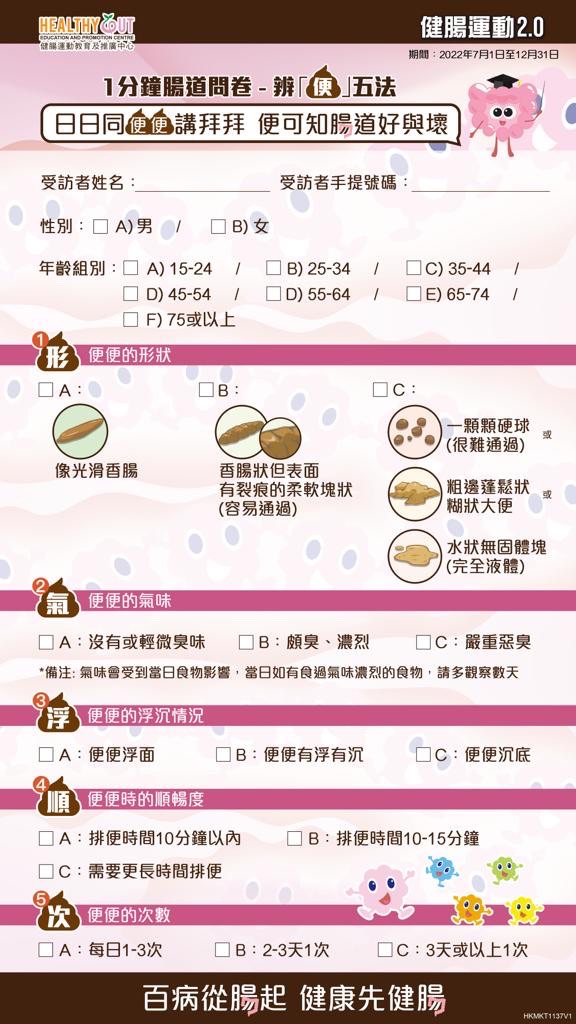 可以同朋友傾開健康問題的時候,詢問對方是否關注腸道健康問題,做人咁多年,有冇試過反轉條腸睇吓?如果冇試過,想唔想知道自己條腸是否健康?想的話,幫我用幾分鐘時間做一份1分鐘健腸問卷啦。