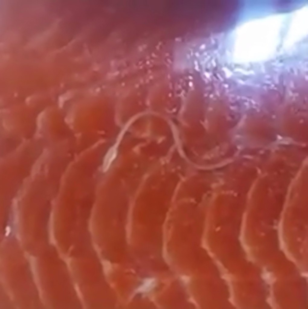 外國超市也常常有人拍攝到包裝的三文魚中有活的寄生蟲🪱在移動中。