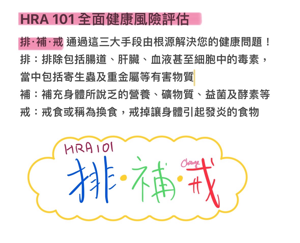 HRA中心的專家或營養師會根據測試者的評估報告,對他們健康上的風險狀況作出專業的分析,從而提供個人化和全面性的解決方案,由「環保身體」的角度,包括:飲食方式,生活習慣,心理調整和功能營養補充等全方位提供專業的建議,有效、迅速、安全地改善身體的自身免疫力及自癒能力,健康狀況一般在2-3個月內有顯著提升(嚴重情況改善約需6-10個月)。